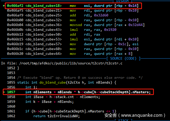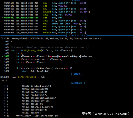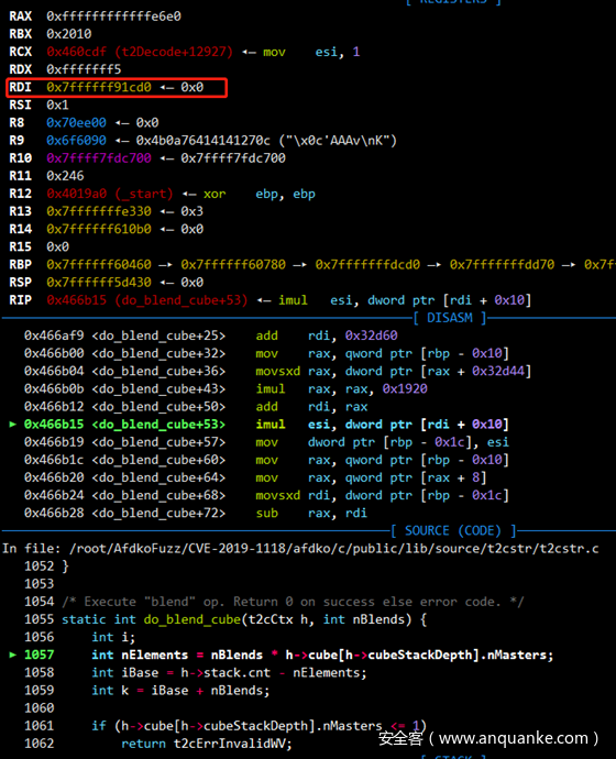 .text:0000000000466B19                 mov     [rbp+nElements], esi可以发现h->cube数组取值是通过乘法实现的,当索引为-1即h->cubeStackDepth==-1时,