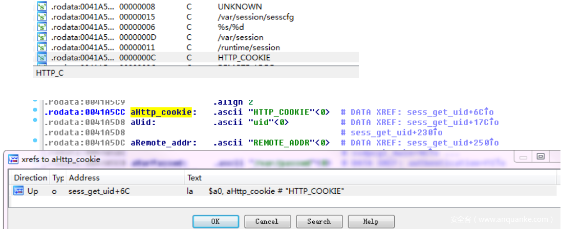 由之前的漏洞介绍可以知道HTTP_COOKIE过长导致漏洞,分别用IDA和ghidra打开cgibin这个文件,在string窗口中进行搜索HTTP_COOKIE,并交叉引用。