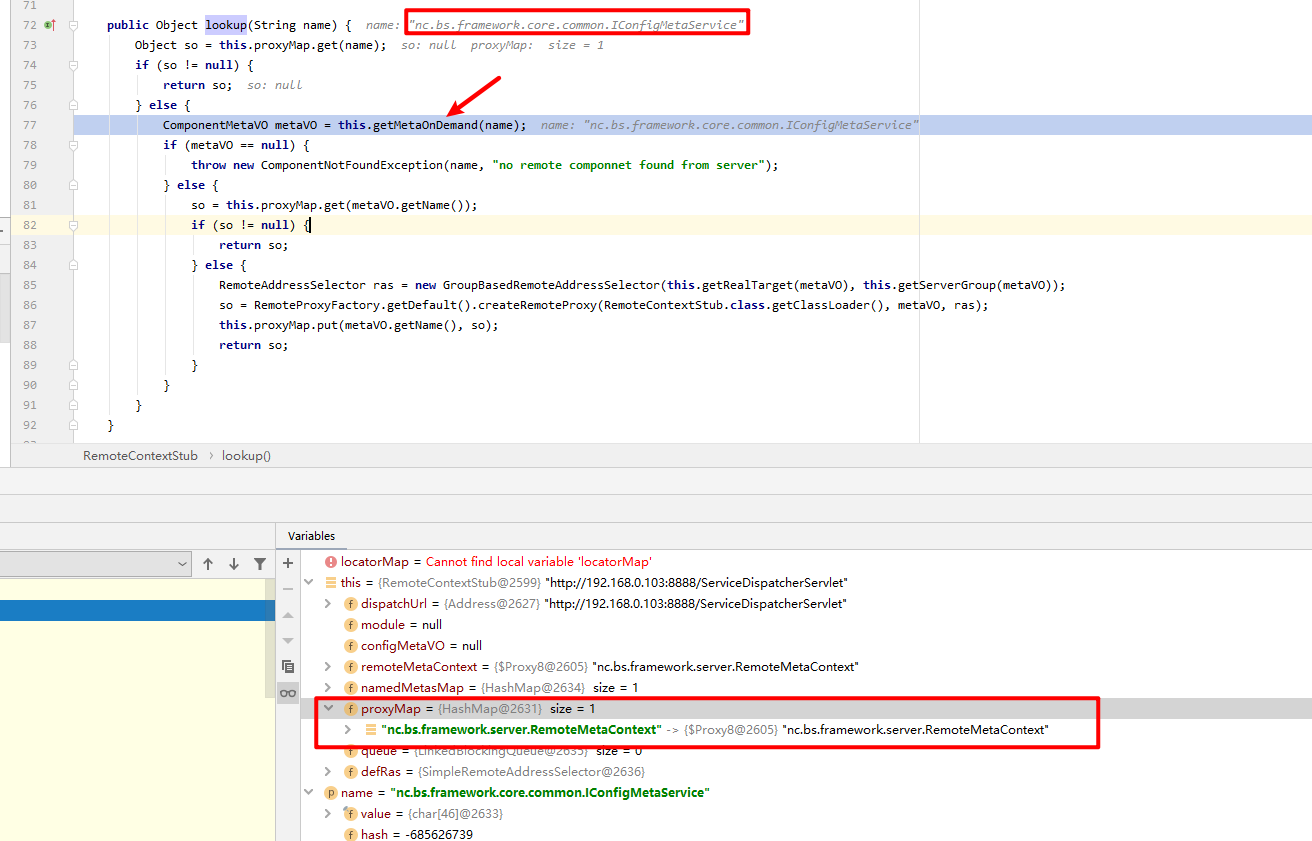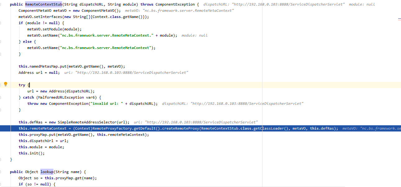 跟进nc.bs.framework.rmi.RemoteContextStub#getMetaOnDemand,又可以看到调用了this.remoteMetaContext.lookup(name);方法,这个变量remoteMetaContext是nc.bs.framework.server.RemoteMetaContext类,那么这个类是怎么来的呢?