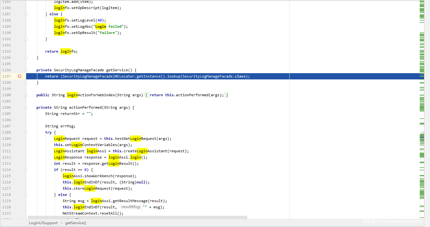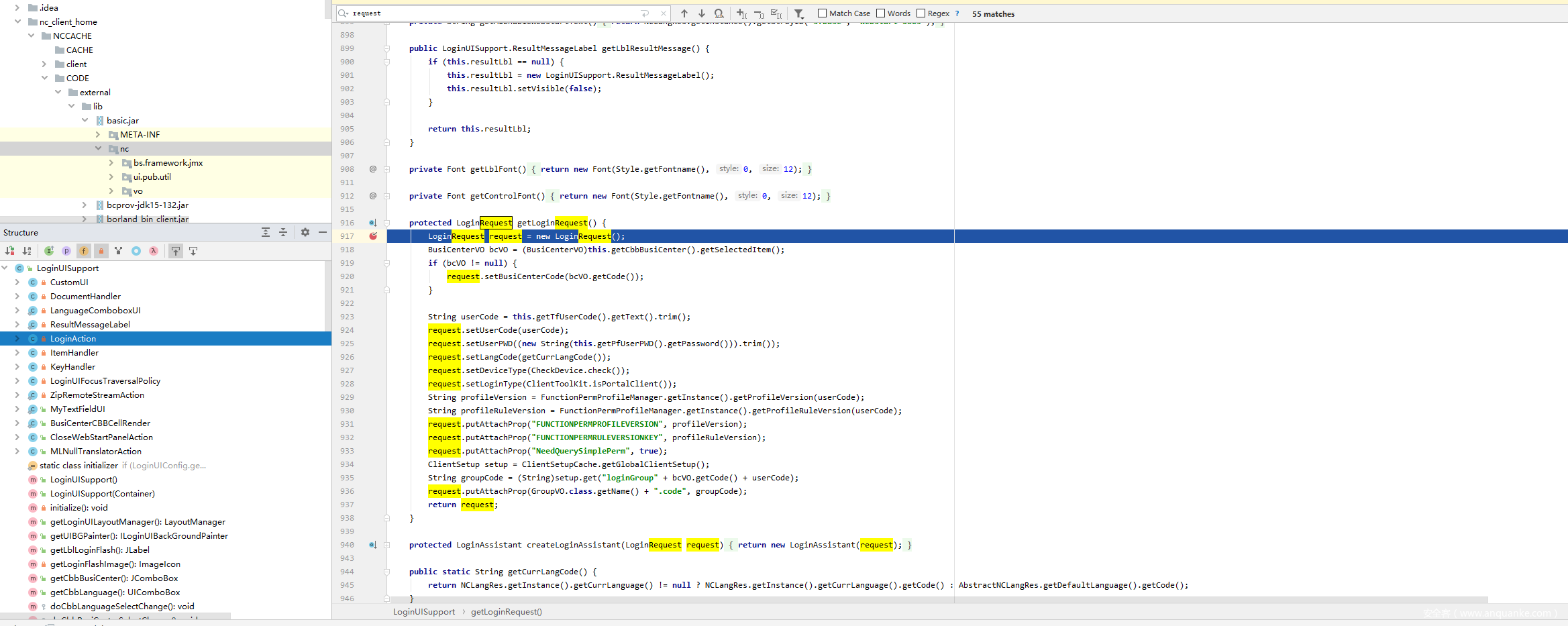 找到对应的nc.login.ui.LoginUISupport类,这个类方法很多,我一开始想的是通过一般登录都是带有request,response的,所以我就搜了request的关键字,在一个看起来比较像处理登录请求的方法下了断点,点击登录后果然是在这个地方断下来了。该方法主要是将输入的用户名、密码等值,在requestd类的变量赋值。