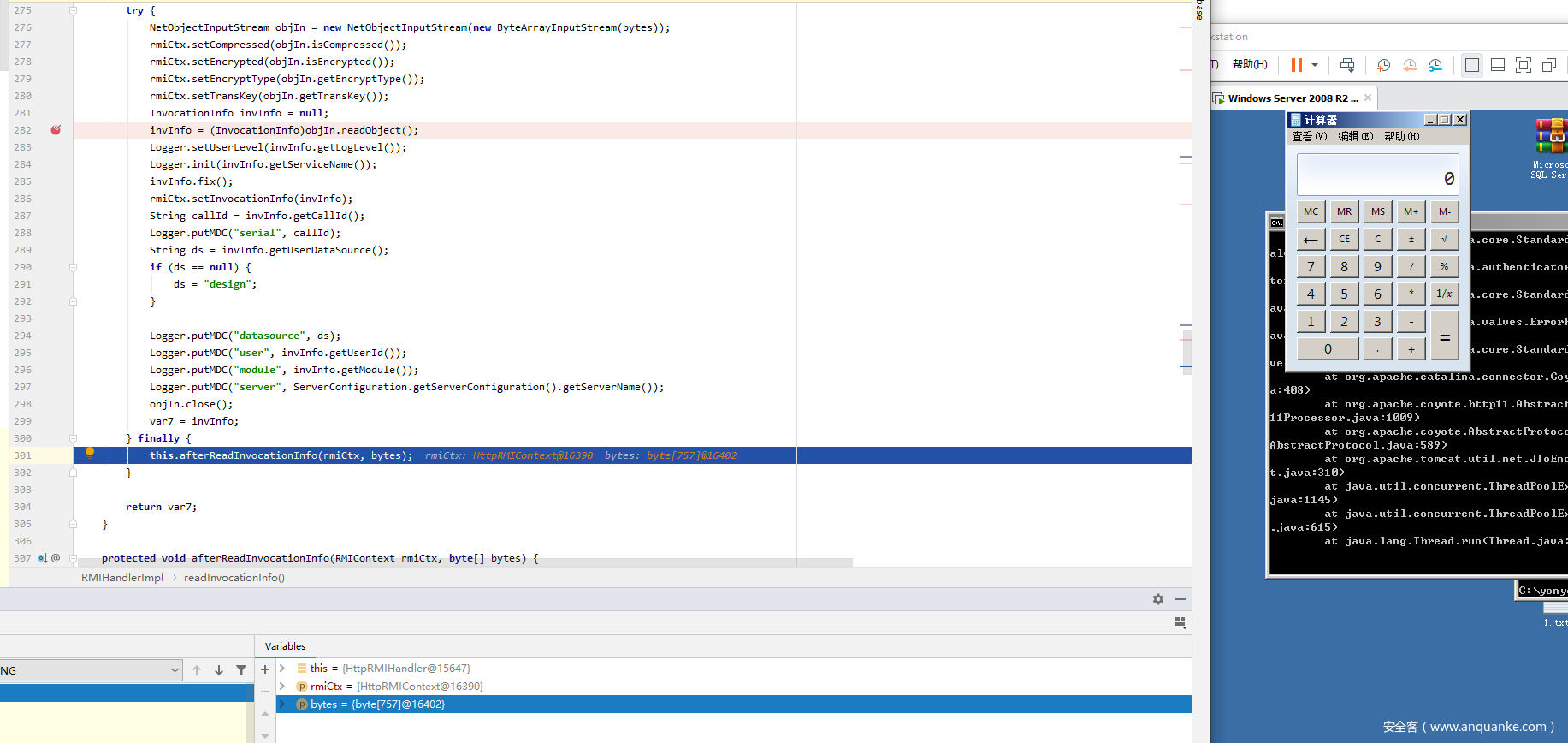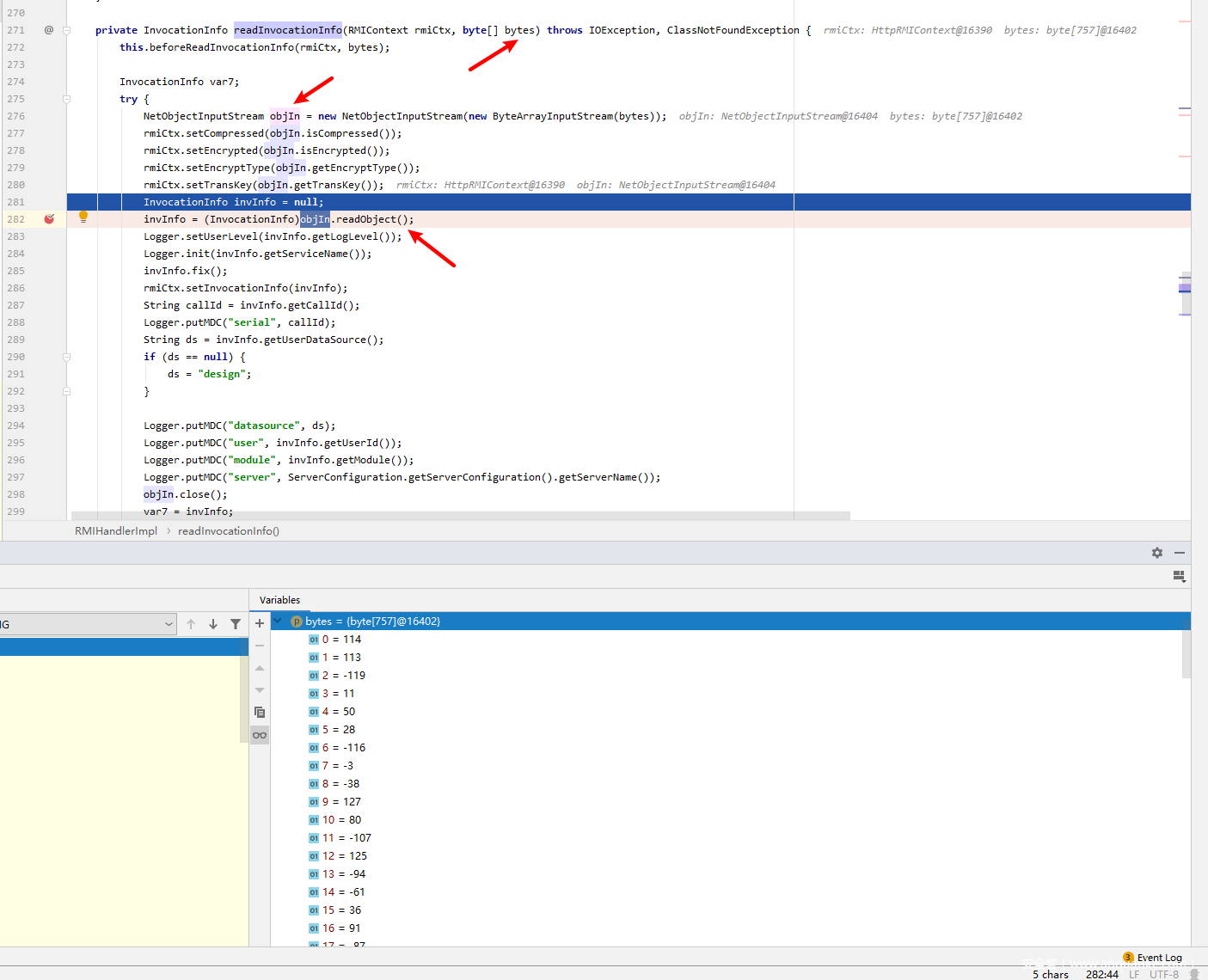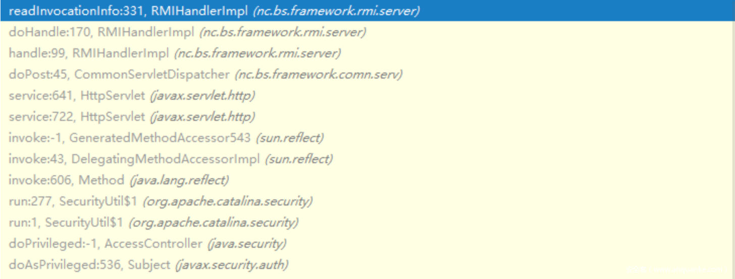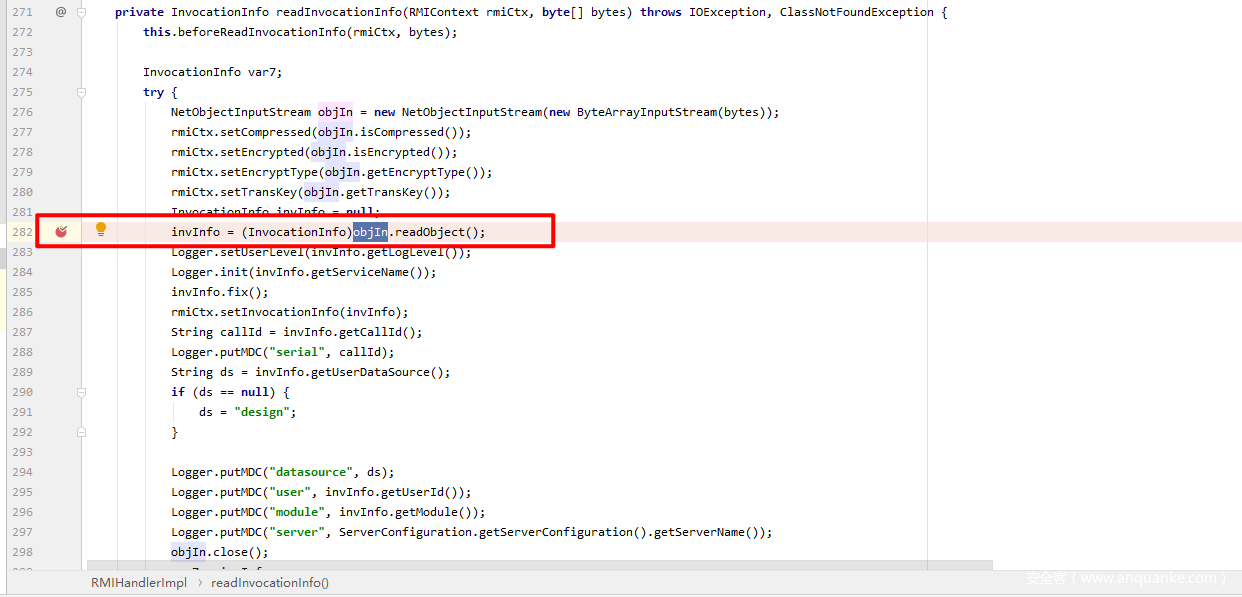 这里注意的是第286行将反序列化后的类赋予到抽象类nc.bs.framework.rmi.server.AbstractRMIContext#invInfo的invInfo变量里,这个变量在下面用到。