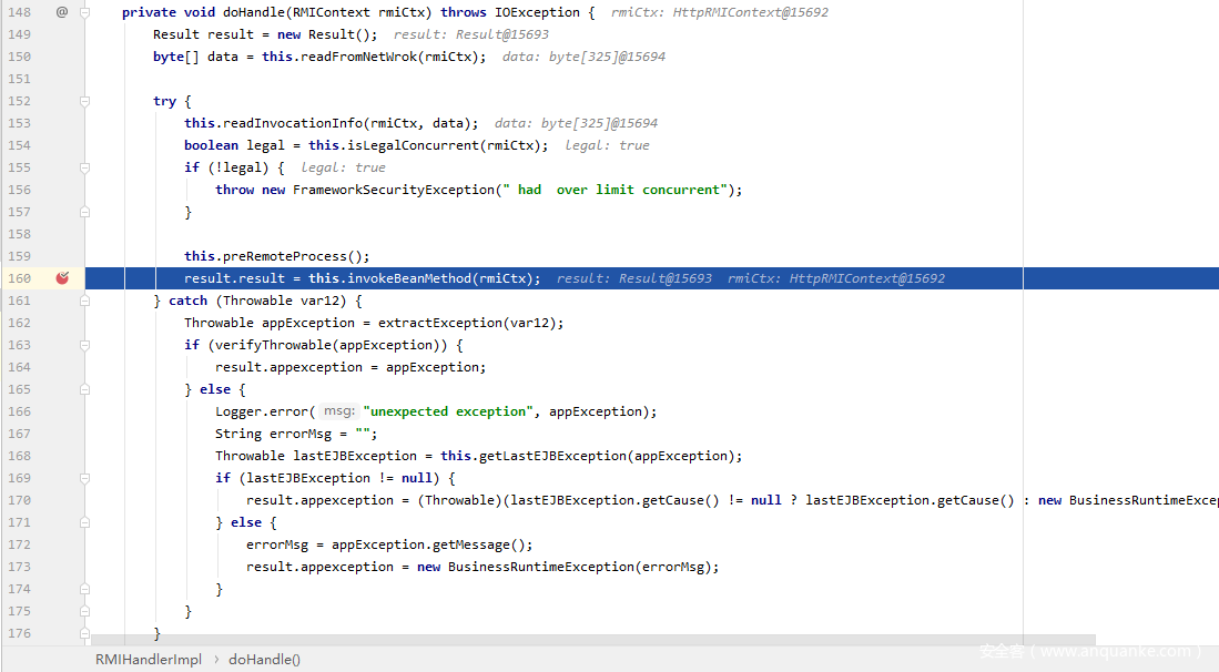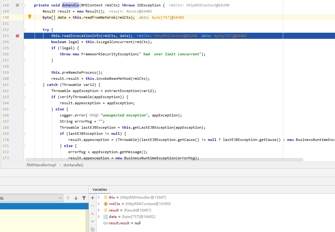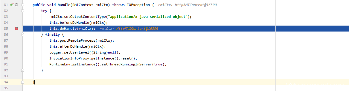 跟进this.rmiHandler.handle(new HttpRMIContext(request, response));,跟进后在第85行继续跟进this.doHandle(rmiCtx);。