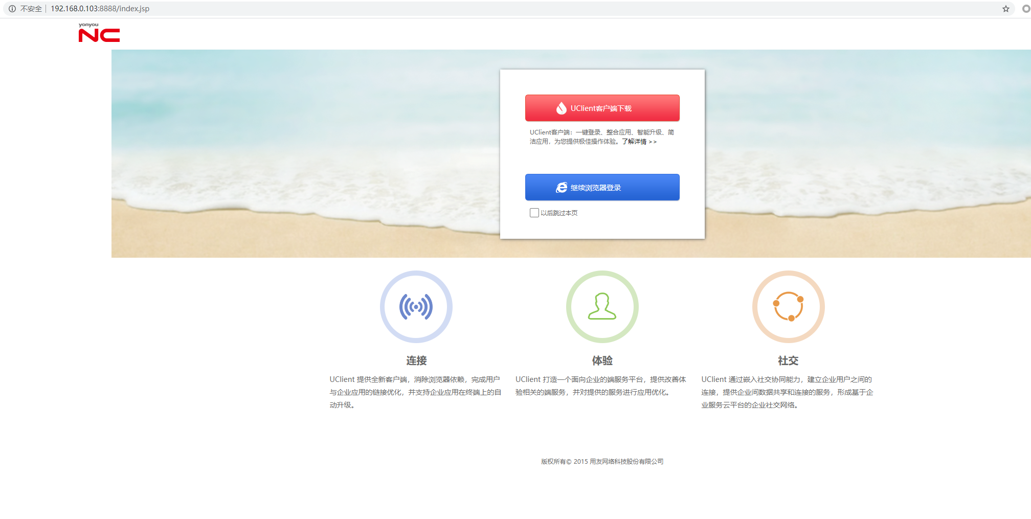 访问http://ip:port/index.jsp 会提示有两种方法登录系统,一种是通过下载客户端、一种是使用浏览器访问。因为,浏览器访问的方式需要依赖不同用户设备上的java版本,IE浏览器,系统配置等环境因素,使用起来不是很方便,所以为了解决这些问题,用友提供了系统专用的UClient浏览器,可直接通过该浏览器访问nc而无需安装配置任何东西。