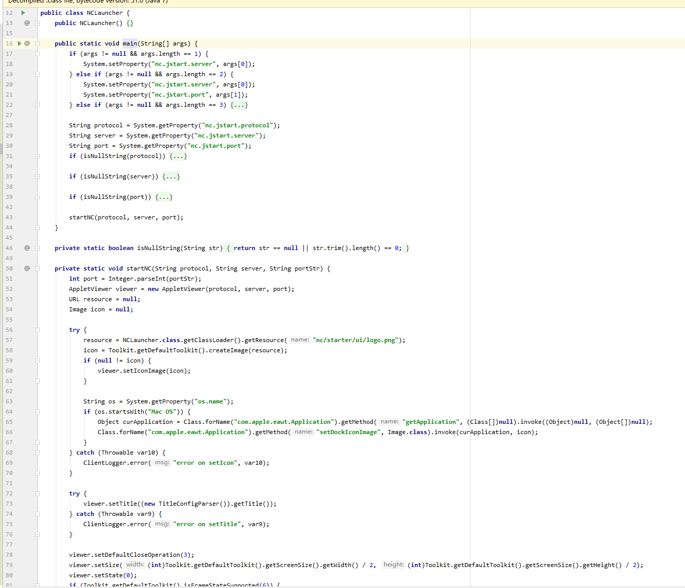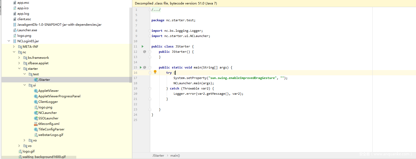 反编译NClogin65.jar,查看nc.starter.test.JStarter,调用nc.starter.ui.NCLauncher#main主要是与远程服务端通信,生成uI之类的操作。主要的通信代码并不在该jar包,继续在目录中寻找。