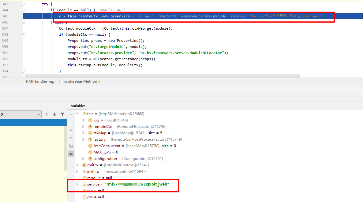 回到刚才的第二个断点,跟进result.result = this.invokeBeanMethod(rmiCtx);,这里第333行就是上面说到的invinfo变量,实际就是反序列化后的类。