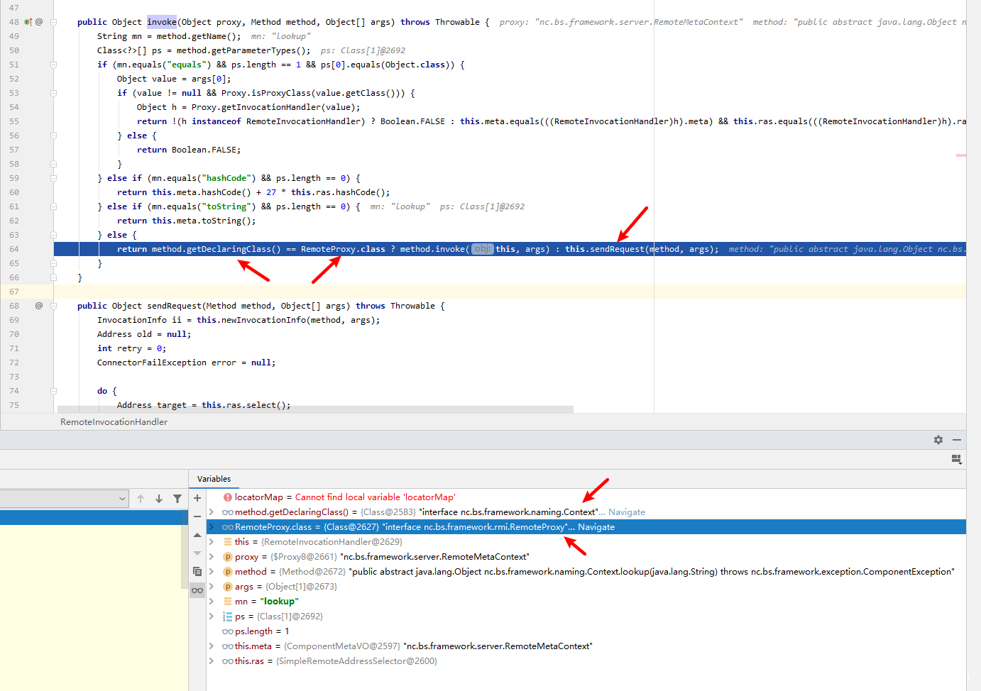 了解java代理的都知道不管用户调用代理对象的任何方法,该方法都会调用处理器(即Proxy.newProxyInstance()的第三个参数)的invoke方法,这里即是nc.bs.framework.rmi.RemoteInvocationHandler#invoke。不懂的可以先看这里。