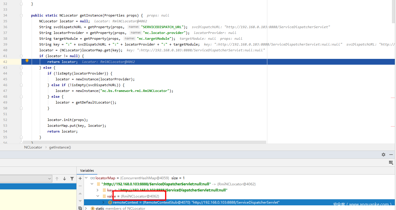 刚启动的时候locatorMap为空,则会在下面的判断分支中,创建RmiNCLocator实例并将该实例存放到locatorMap中。