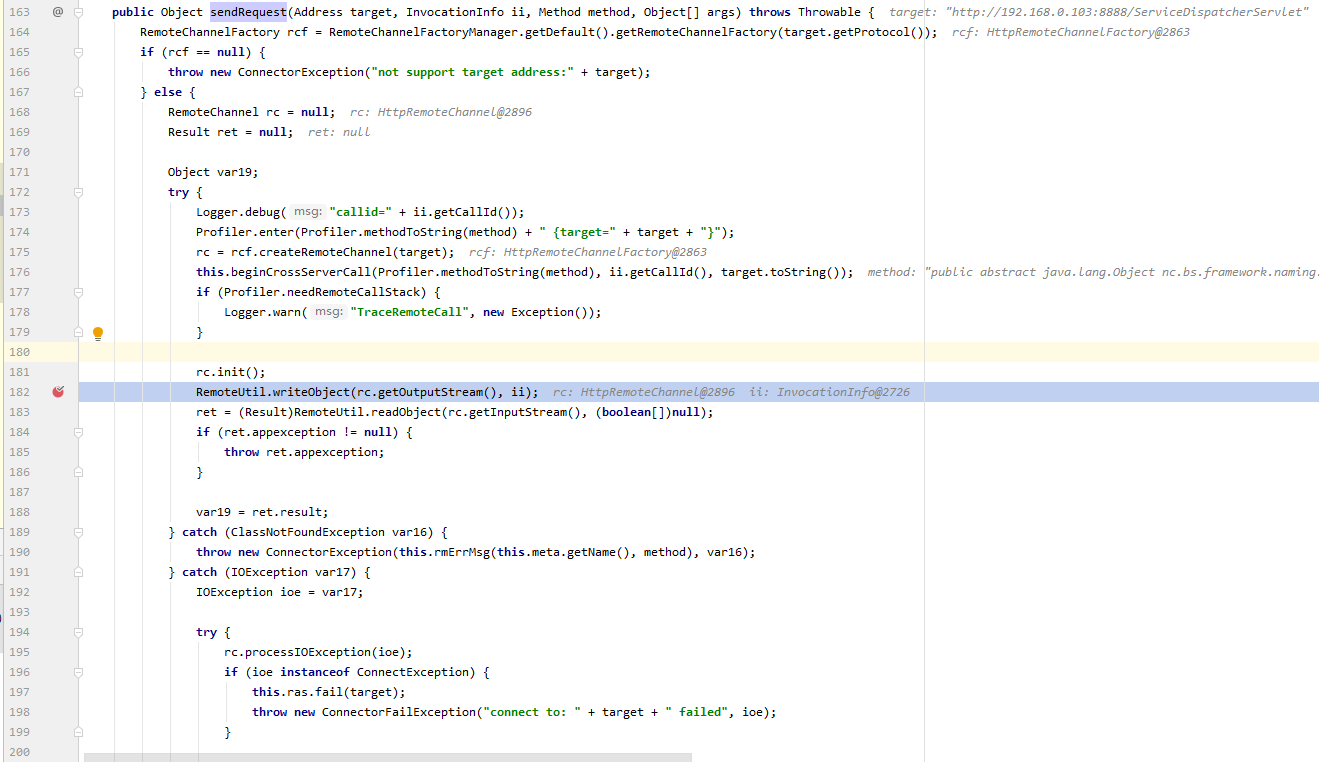 继续跟进this.sendRequest(target, ii, method, args);,在第182行将ii序列化输出,发送到http://server:port/ServiceDispatcherServlet ,并获取服务端返回的结果反序列化,回显到客户端。
