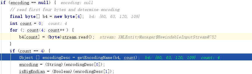 根据XML文档头4个字节选择字符流读取器的关键代码位于 jdk1.8.0_191src.zip!comsunorgapachexercesinternalimplXMLEntityManager.java: