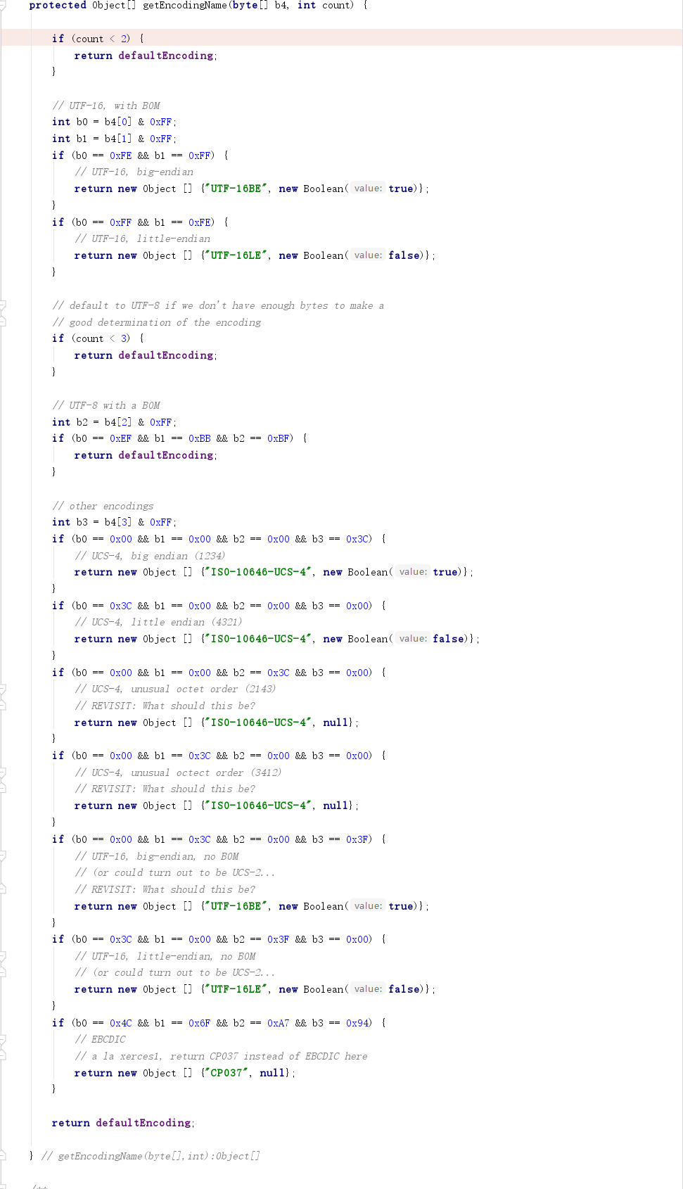 判断字符集的getEncodingName方法代码如下,其中UCS-4 2143、UCS-4 3412字最后是会抛异常提示不支持的字符编码。