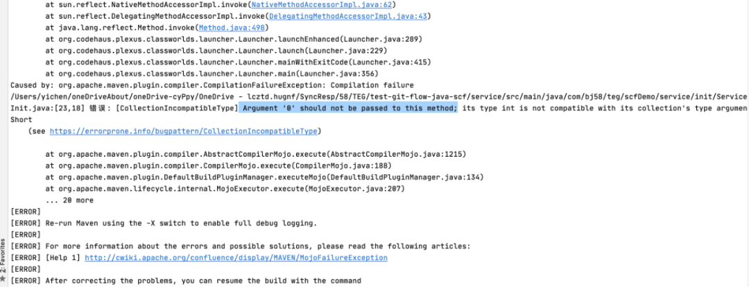 如果发现缺陷点,将抛出CompilationFailureException 异常,且导致mvn构建失败: