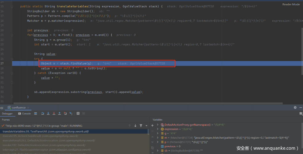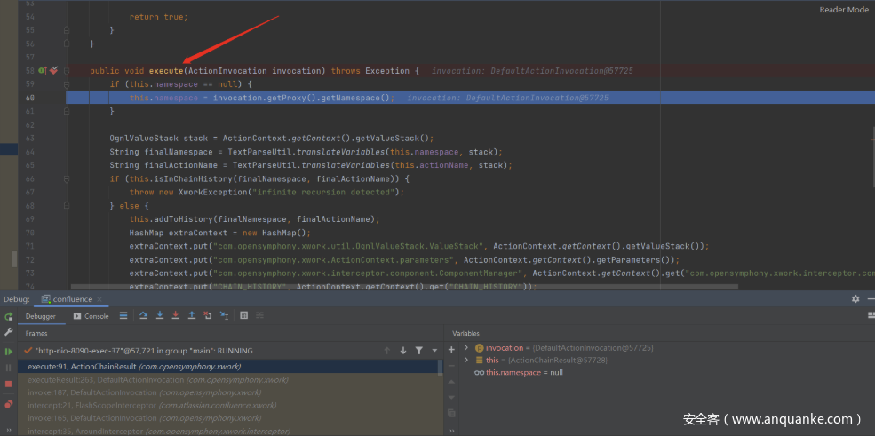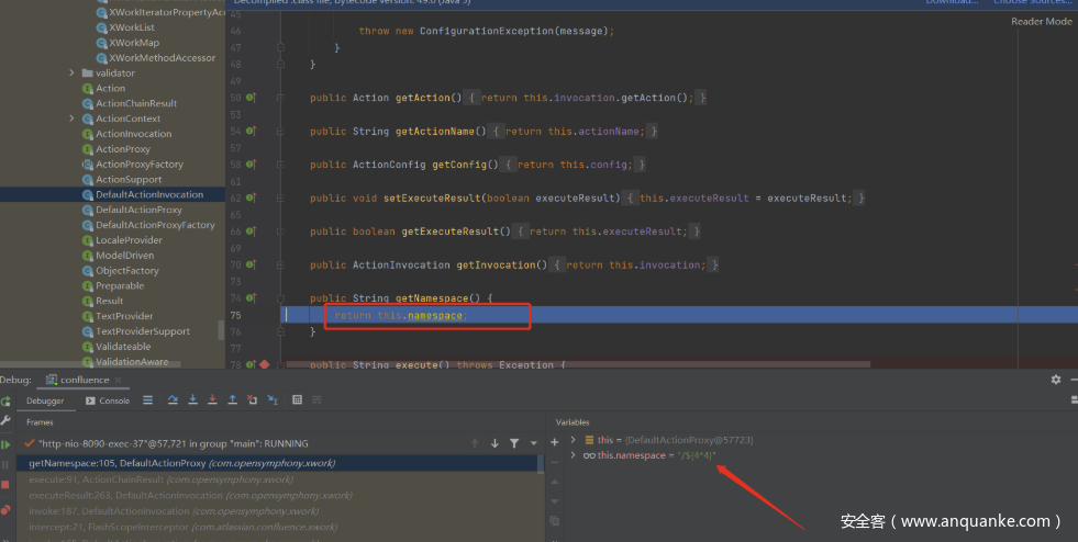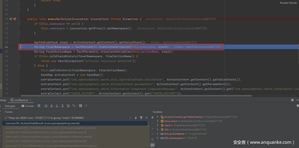 继续跟进,在com.opensymphony.xwork.ActionChainResult中,会调用translateVariables函数对OGNL表达式进行解析,表达式的值为namespace的取值。