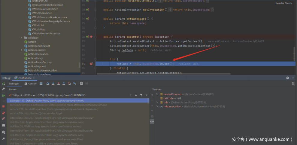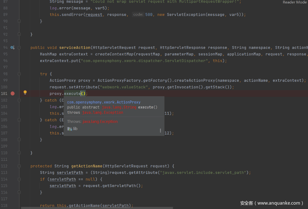 到com.opensymphony.xwork.DefaultActionProxy#execute,实例化 DefaultActionProxy 对象,调用其execute函数。