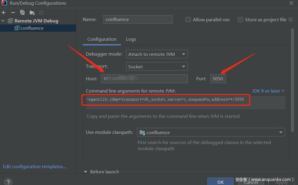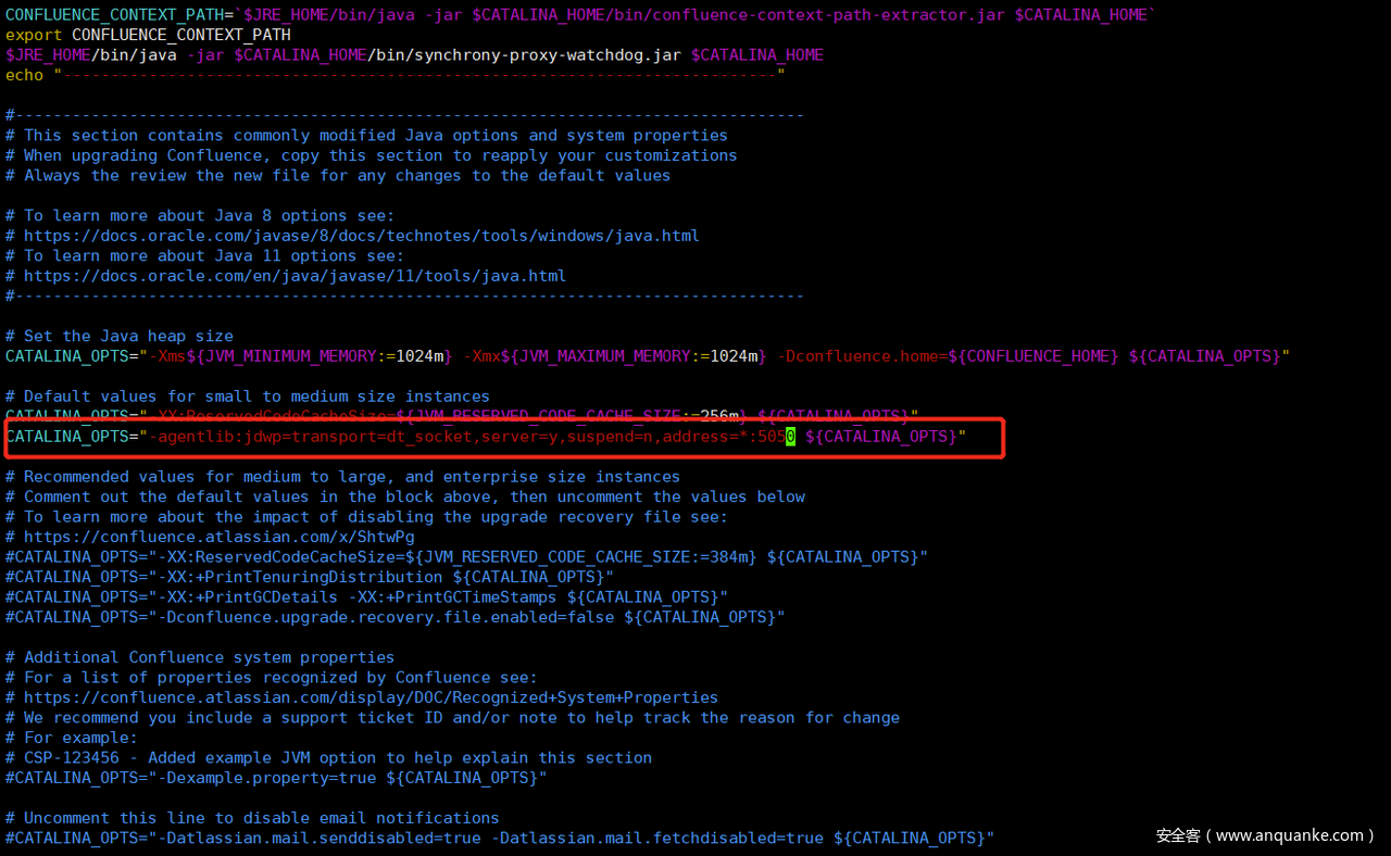 在容器中/opt/atlassian/confluence/bin目录下修改setenv.sh文件,加入远程调试配置。