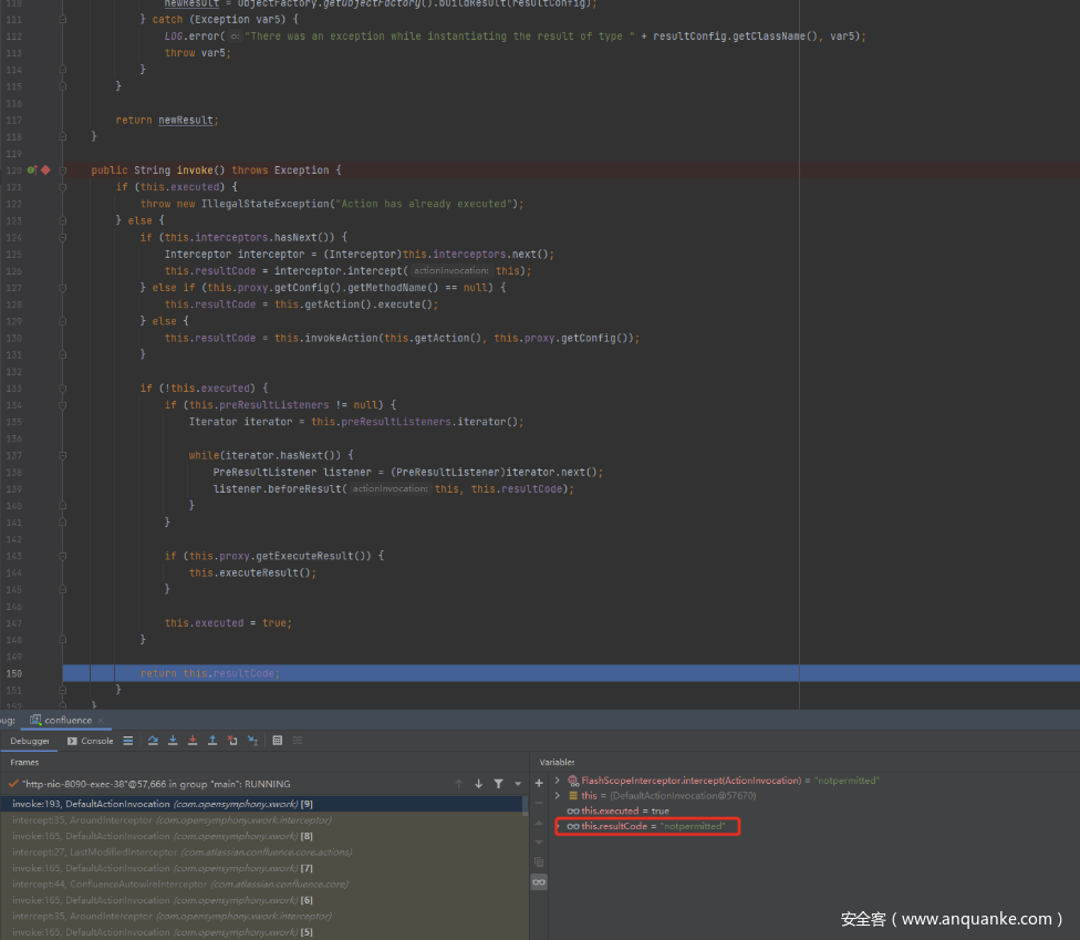 通过不断调试,发现在满足一定条件之后,将不会继续调用invoke函数,而是将返回 notpermitted 并赋值给 resultCode,跳出循环。