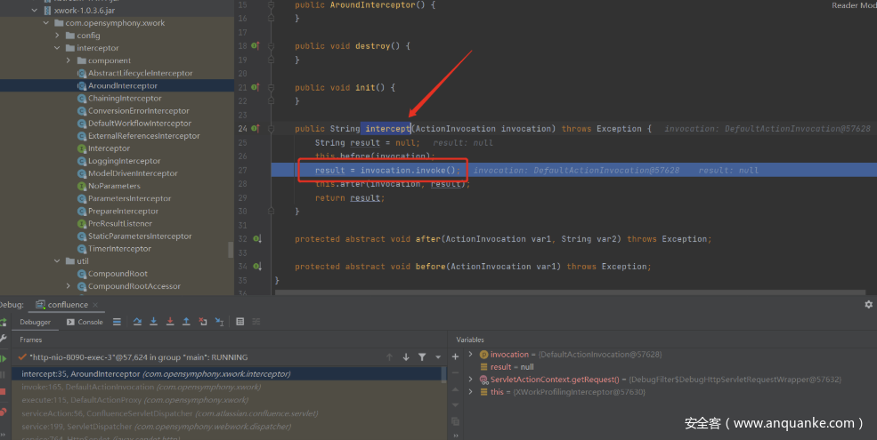 继续跟进来到com.opensymphony.xwork.interceptor.Aroundlnterceptor#intercept,发现invoke函数通过调用intercept方法,形成迭代循环。