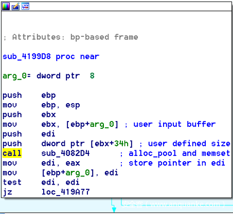 在对sub_4199D8进行了逆向分析之后,我们得到了它的内部构造。它所接收的第一个数据就是我们的用户缓冲区,然后使用了一个位于偏移量0x34的值来当作调用另一个函数的参数: