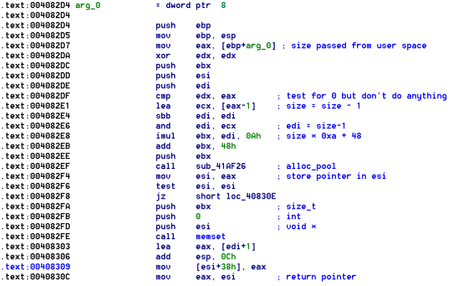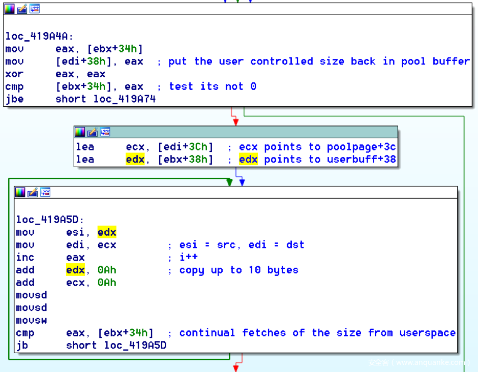 这里的逻辑其实非常简单。从user_buff+0x38和pool_buff+0x3C开始,它会重复地每次复制10字节数据。需要注意的是,循环会拿计数器(eax)跟用户定义的大小(ebx+0x34)进行比较,这也是一种常见的循环条件。