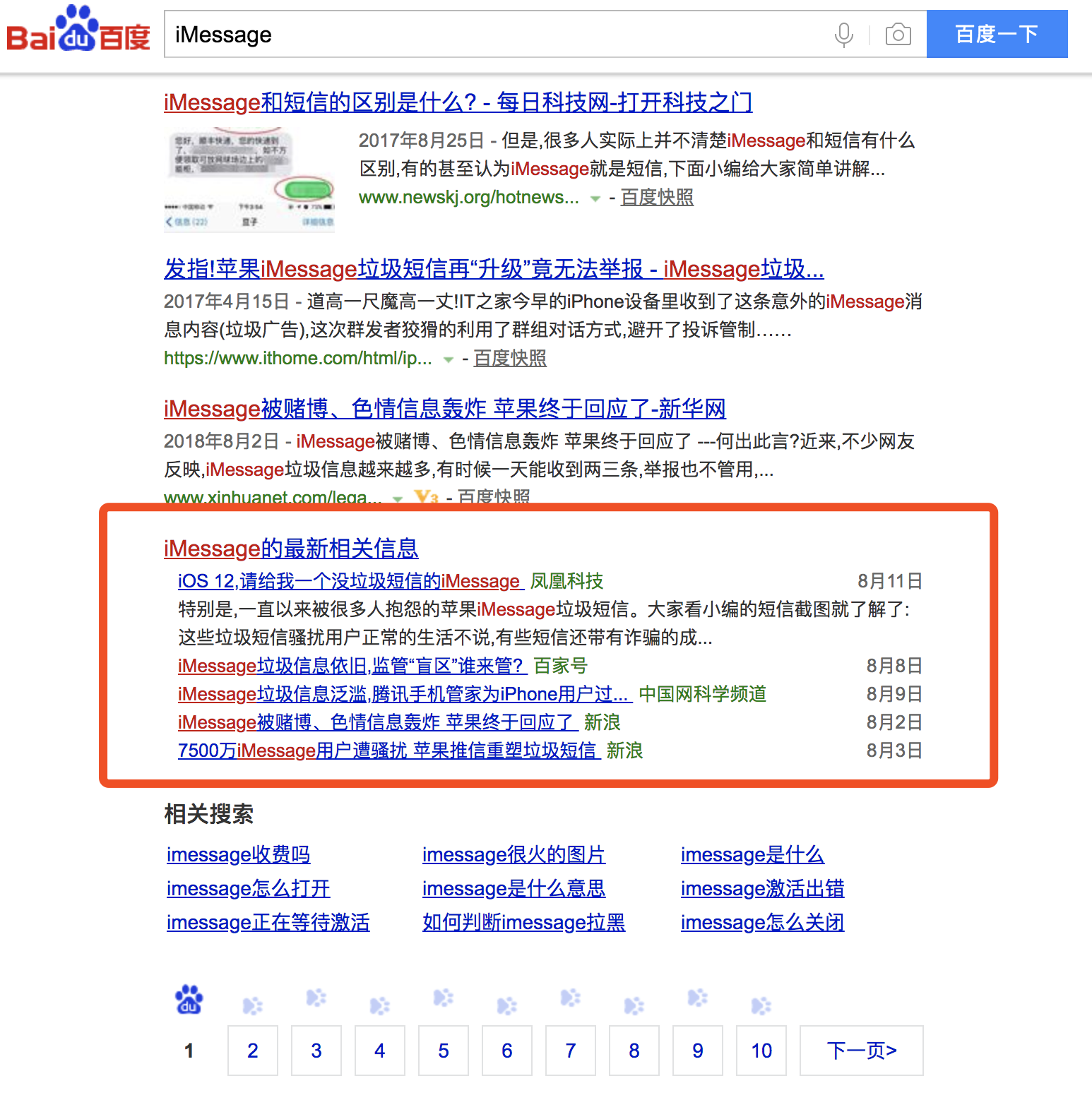 但是,iMessage给大家留下更多印象的还是,包含赌场、博彩广告,开发票广告、色情影片推荐、贷款、刷单、贩卖高仿A货、药物等内容的垃圾短信。emmmmmm……这个Magiccc写过揭秘 | 2亿苹果用户的魔咒,澳门威尼斯人短信背后的黑产帝国,大家对此深恶痛绝的程度,百度一下便可知: