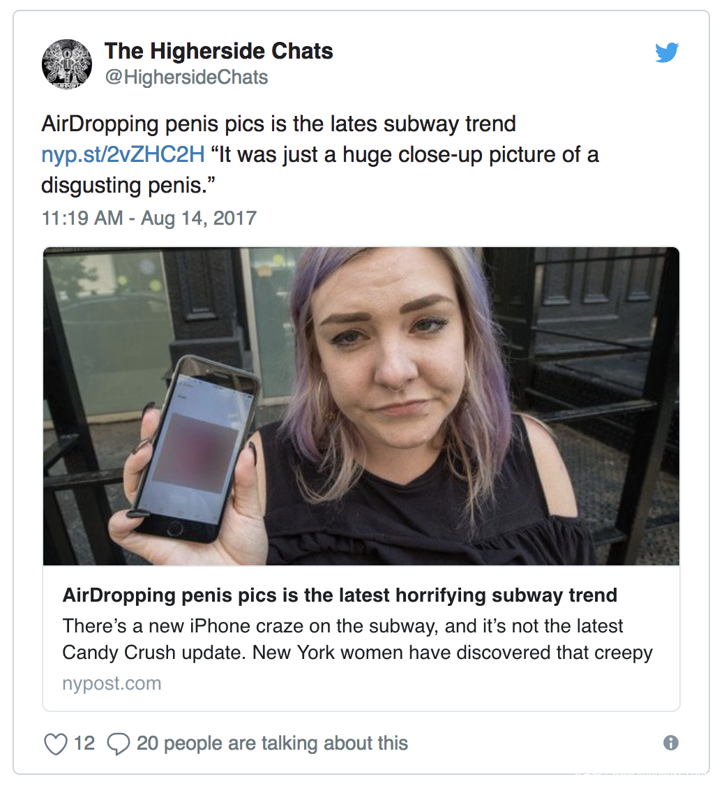 AirDorp“骚扰”在国外频发,全球第一起“Cyber flashing”案件,发生在2015年8月13日的伦敦市,一位女性通勤者被同一列火车上班的陌生人通过AirDrop,发送了几张生殖器照片。