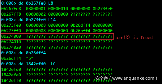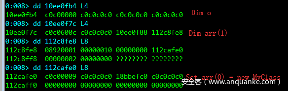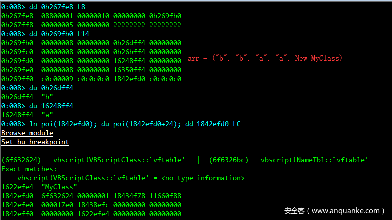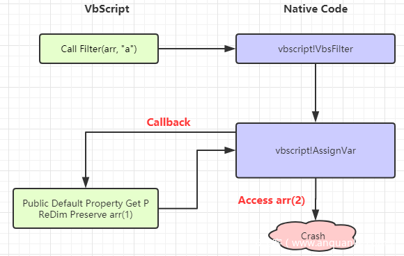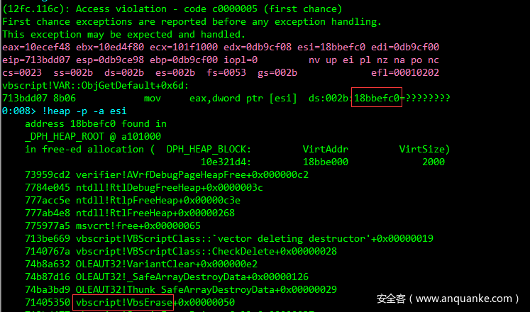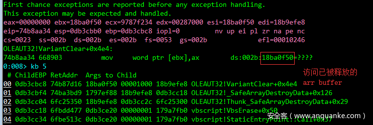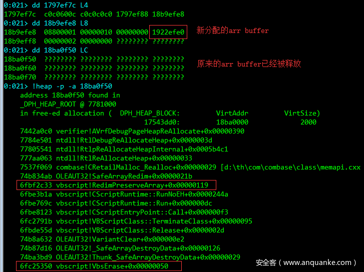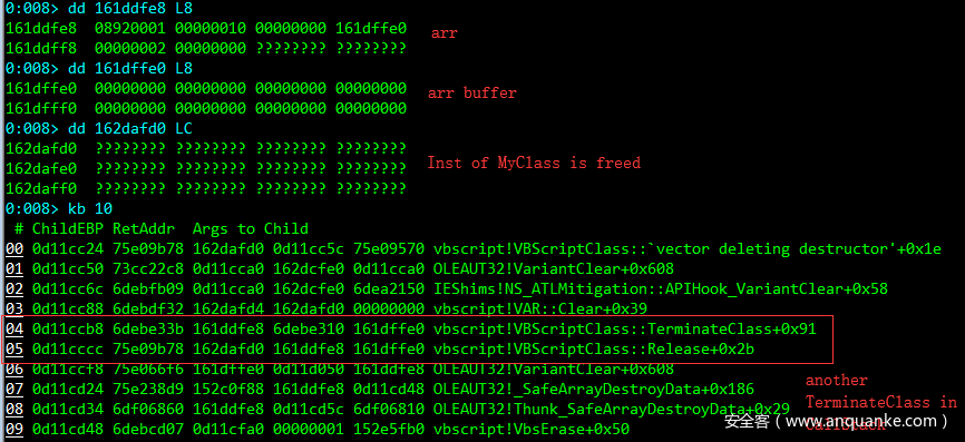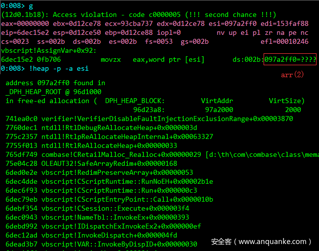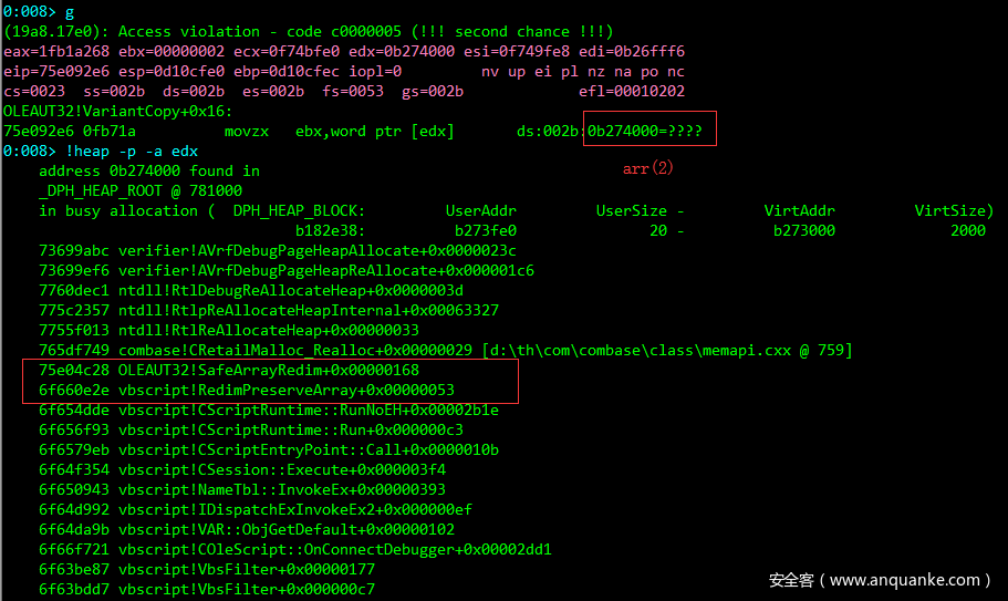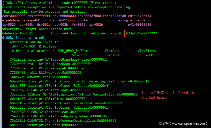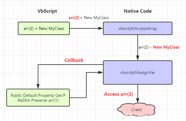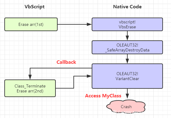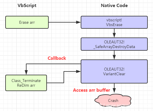 OLEAUT32!VariantClear中如果元素是对象,且对象的引用计数为0,则调用该对象的析构函数,从而触发脚本函数Class_Terminate的回调。在Class_Terminate重新定义了arr的大小,导致原始arr buffer被释放,但是OLEAUT32!VariantClear中依然保留了原始arr buffer地址,当再次访问该地址时触发crash。