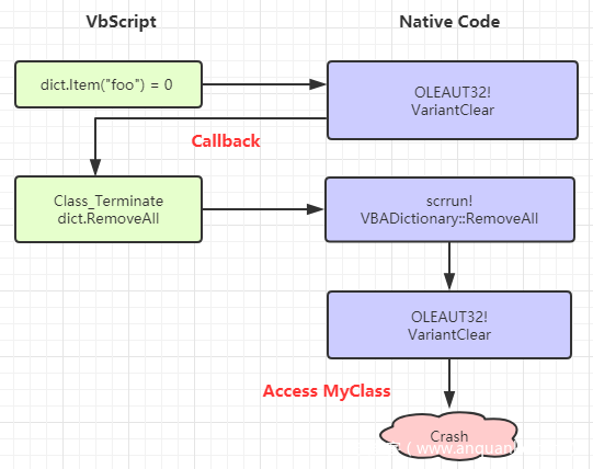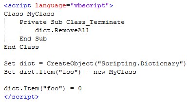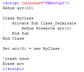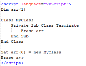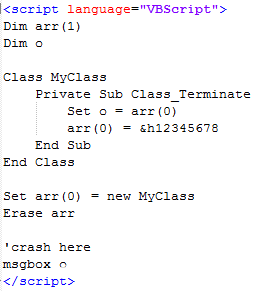 VBScript存在类的概念,VBScript类支持两个事件:Class_Initialize和Class_Terminate。在类实例化的时候会触发Class_Initialize事件,同样在类实例被销毁的时候会触发Class_Terminate事件。VBScript支持在脚本中通过添加自定义Class_Initialize或Class_Terminate事件的方法在脚本中手动做一些初始化或者释放的操作。也就是说自定义Class_Terminate给了VBScript引擎执行过程一次脚本回调的机会,如果在脚本回调过程中手动修改了一些数据,就可能触发一些未知的情形。