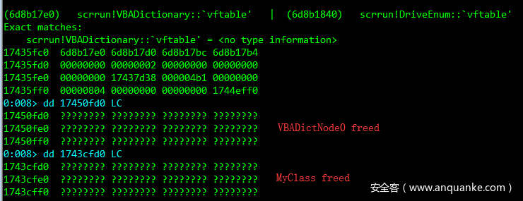但是仍然可以找到其他可以替代arr的容器,比如这里的Dictionary。其漏洞原理和CVE-2018-8242相似,同样是在Class_Terminate再次尝试释放(dict.RemoveAll)正在处于半释放状态下的VBScriptClass,最终触发Double Free。