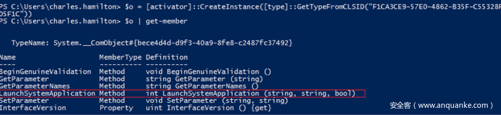 以{F1CA3CE9-57E0-4862-B35F-C55328F05F1C}这个COM对象(WatWeb.WatWebObject)为例,这是Windows 7上的一个COM对象,该对象会对外提供名为LaunchSystemApplication的一个方法,如图4所示: