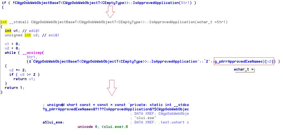 但这个COM对象是否可以创建任意进程呢?用户可以控制传递给CreateProcess的参数,并且该参数派生自传递给上一级函数的参数。然而我们需要注意到一点,在调用CreateProcess之前,代码首先会调用CWgpOobWebObjectBaseT::IsApprovedApplication。该方法对应的Hex-Rays伪代码如图6所示。