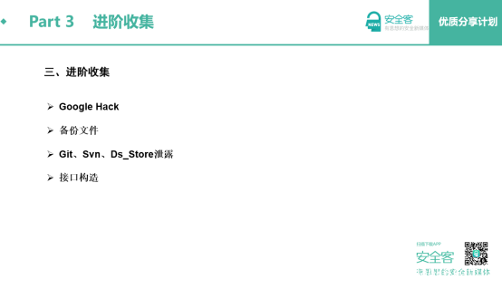 进阶收集,相比于传统收集方法,这里提到了更多收集信息的姿势。进阶收集针对性更明显一些,就是冲着敏感信息进行收集。
