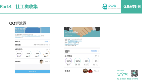 社工类收集是目前寻找敏感信息的一个新方向,这里提到了qq群泄露、公众号泄露等一系列例子。让大家在测试过程中尽可能打开自己的思路,找到更多的敏感资产。