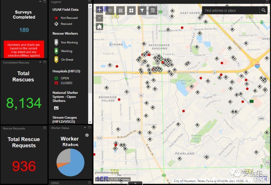 这个Web模型仪表板托管在Esri ArcGIS Online。用户可以在模拟的“实时”资源管理仪表板环境中与地图和数据进行交互。交互地图提供有关救援请求、救援完成、救援人员的状况以及医院和庇护所的状况的位置和表格数据,这对于当下的新型肺炎治理来说,有着直接的参考意义(例如有新闻报道部分因封城滞留外地的武汉人被宾馆和交通部门拒绝后,由于缺乏公开统一的资源查询工具,有的去了网吧,有的去了民宿,有的甚至滞留街头,而出现发热症状的,也无法根据医院接待能力和优先级来选择就诊)。