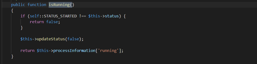 此处需要跳过第一处的判断,跟进isRunning方法,很简单