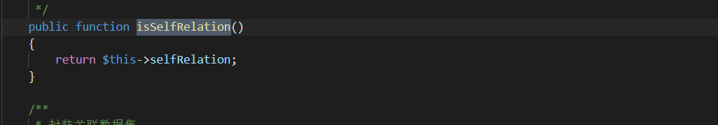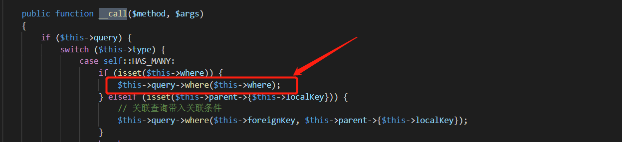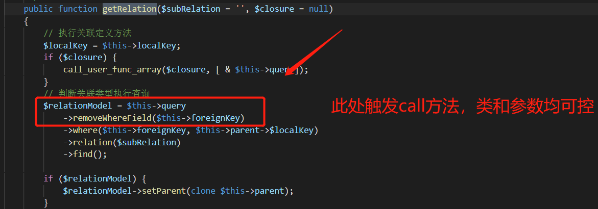 接上图,他们构造的poc没能完成if语句的判断,最终进入了else分支,如果方法存在,则调用getRelation方法,由于modelRelation参数是可控的,所以可调用任意类的getRelation方法,找到HasOne类的getRelation方法