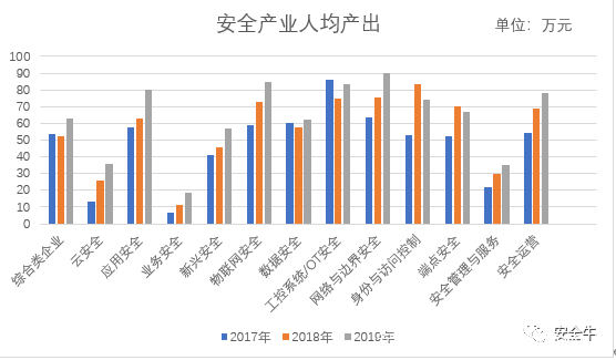 2019年,安全行业平均人均产出为63.82万元,结合近三年来各企业的收入情况,计算各领域的人均产出,可以看出: