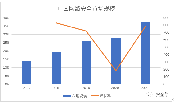 安全牛百强及全景图收集行业信息,基本覆盖网络安全产业企业,以计算企业收入总和加预估未收录企业收入形式,统计各年度安全产业市场规模(跨行业综合性厂商只计算安全类业务收入)。计算得出,2019年国内网络安全总市场规模580亿元,较上年增加32%,2020年受疫情影响市场增量较小,但相对其他行业仍属较快增长,预计增长规模为8%,同样计算从2017年至2020年网络安全市场情况如下图所示。