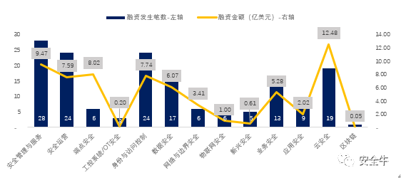 按交易笔数统计:2019年,境外网安市场发生交易笔数前三的分别为,安全管理与服务行业以14起交易位居第一;云安全位列第二,发生了12笔融资;身份访问与控制和数据安全并列第三,都发生了11笔融资。