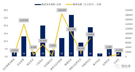 2019年按交易金额统计:截至2019年年末中国网安市场发生交易笔数前三的分别为身份与访问控制18.4亿元人民币,安全运营14.0亿元人民币和数据安全10.1亿元人民币。