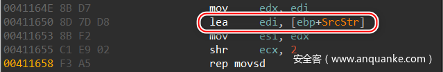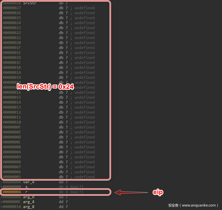 从下图可以看出,函数给SrcStr变量分配的大小是0x24个字节,Name长度超过该大小就会造成栈溢出。