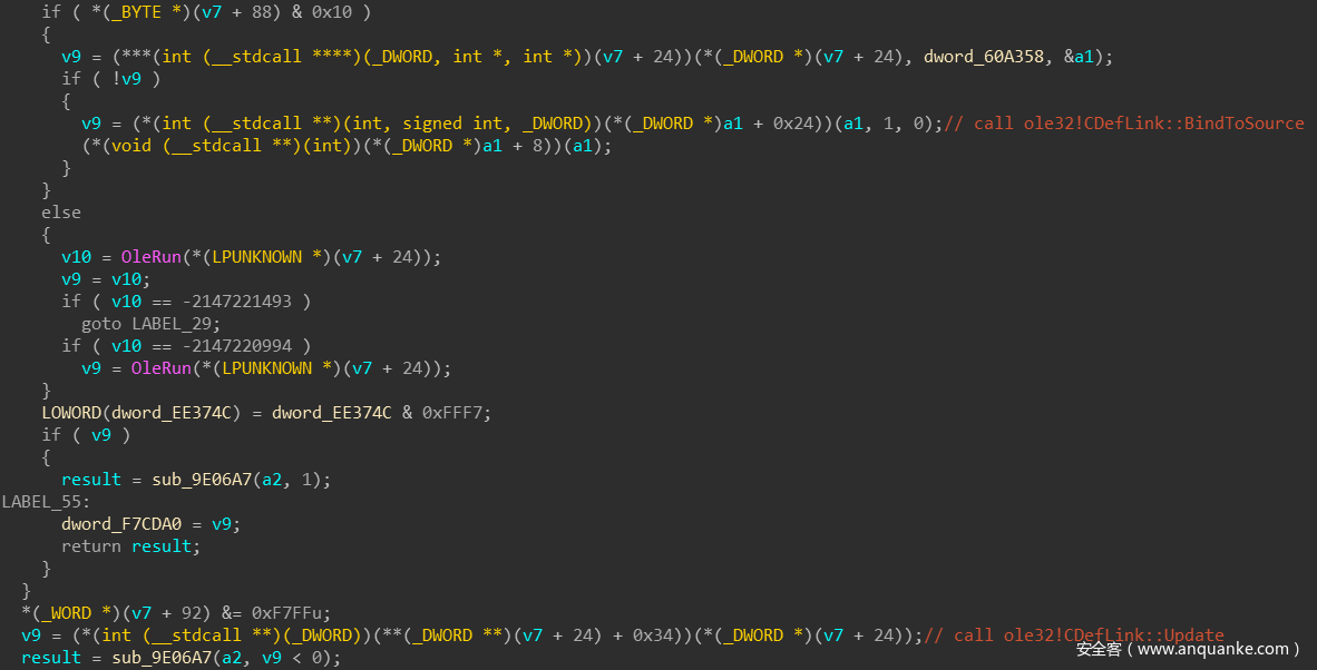 不过,许多分析过CVE-2017-8570的读者可能会观察到一个奇怪的现象:漏洞中触发时script脚本中的代码会被执行两次。这是为什么呢?原来,在这个漏洞的触发逻辑中,会涉及到wwlib.dll库中的一个函数调用,该函数内部会顺序调用ole32!CDefLink::BindToSource和ole32!CDefLink::Update两个函数,如下(以office 2010为例):