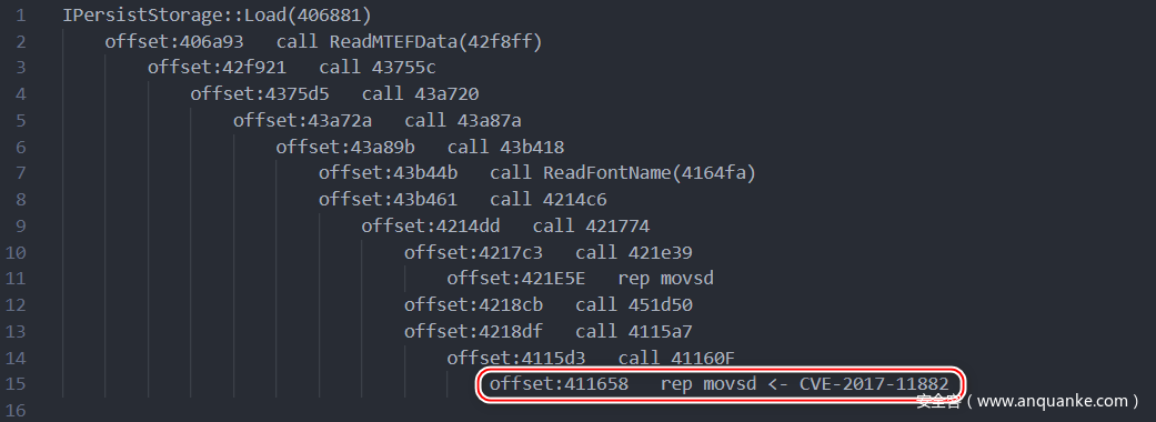 该漏洞的成因为:在读入“Equation Native”流中的Font Name Record数据时,在将Name拷贝到某个局部变量的时候没有对Name的长度做校验,从而造成栈缓冲区溢出,漏洞发生点如下图所示:
