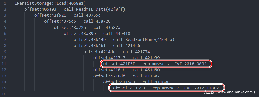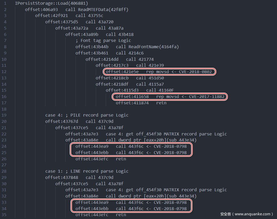 对于第二类漏洞,其难点在于对相似漏洞之间的区分。从CVE-2017-11882开始,到CVE-2018-0802,再到CVE-2018-0798,三个都是非常相似的漏洞,在静态层面不容易区分,本文将分享一个在动态层面区分它们的方法。