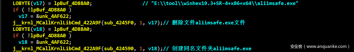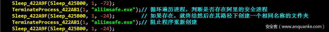 1号傀儡进程,如果发现存在aliimsafe.exe进程就会结束该进程,并删除aliimsafe.exe文件,然后在aliimsafe.exe所在目录下创建一个同名文件夹,阻止aliimsafe.exe进程重新创建。