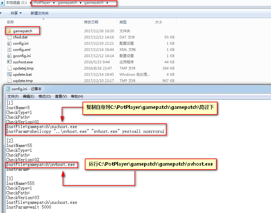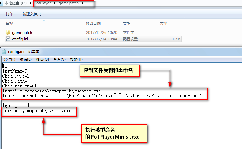 - PotPlayerMinis.exe读取gamepatch中的config.ini配置文件。以配置项InstParam指定的参数运行InstFile配置项指定的程序suchost.exe(其实是NirCmd.exe),从而实现把PotPlayerMinis.exe拷贝到配置文件所在路径下,重命名为svhost.exe,启动配置项mainExe指定的程序的目的。