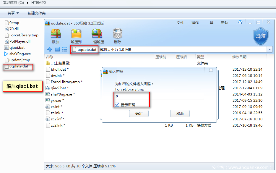 调用updatej.tmp解压缩C:\HTEMP0\uqdate.dat中的 qiaoi.bat到C:\HTEMP0\路径下。(解压密码是p(小写))