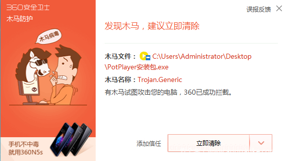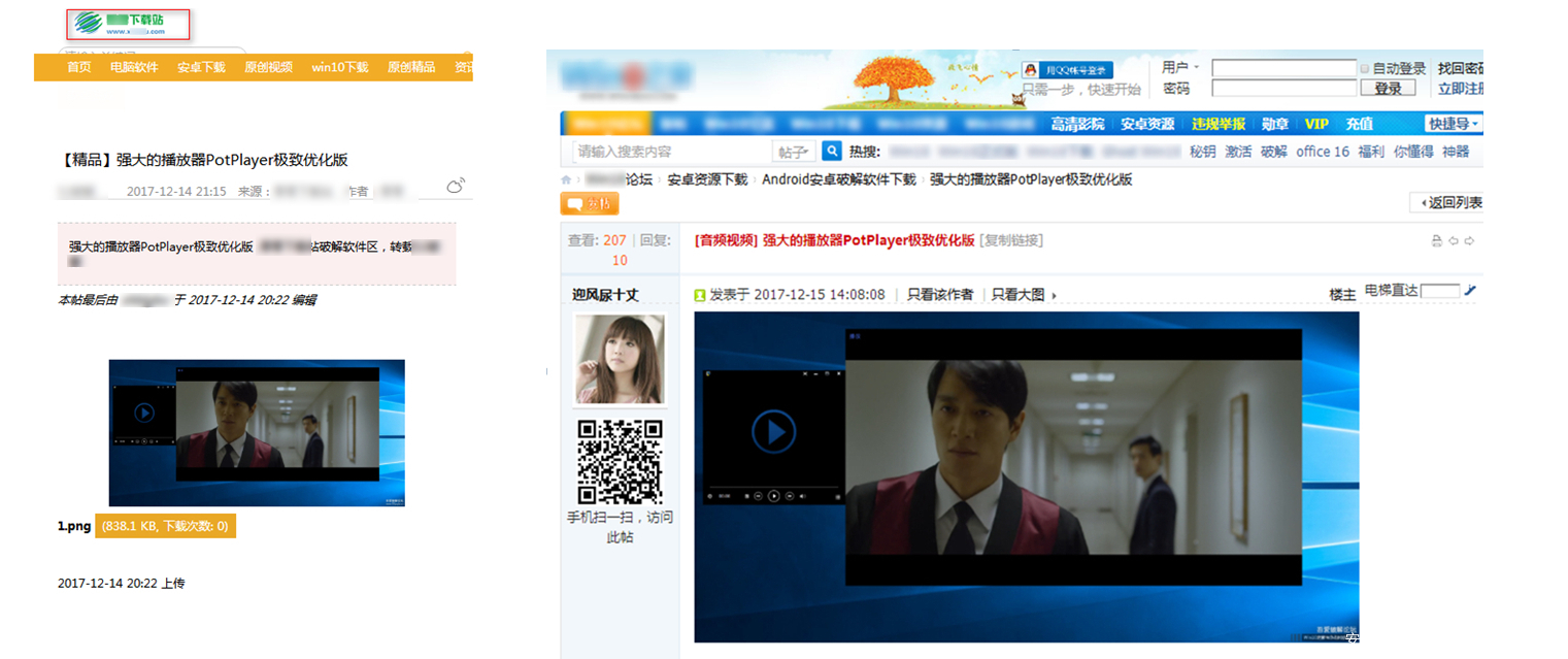 近期360安全卫士在软件下载站拦截到了利用PotPlayer播放器传播的远控木马,该木马巧妙的利用了正常文件和加密脚本,通过内存解密载入恶意代码,进行远控。通过检测多个安全进程,改变自身运行流程,对抗杀软查杀。主要功能是:记录键盘输入,盗取用户的账号信息以及远程下载其他木马,隐蔽性非常高,而且通过下载站大量的传播。