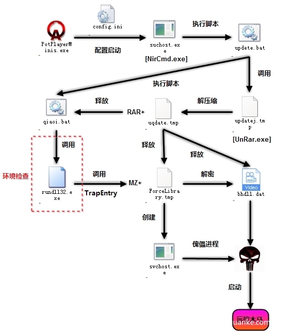 木马利用了白加黑技术来躲避查杀,并且采用了多个脚本文件和多次加密,具体流程如下: