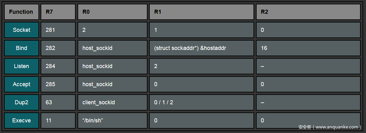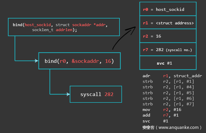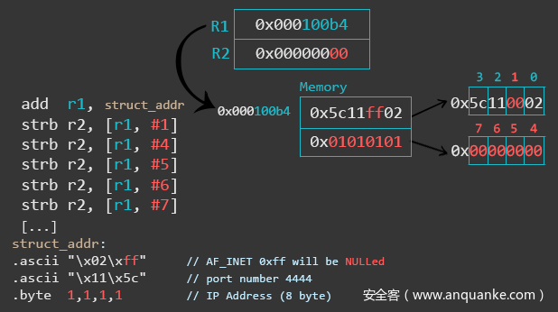 第一条STRB指令会将x02xff中xff这个占位符替换为x00,以便将AF_INET设置为x02x00。那么我们怎么知道我们使用的是一个null字节呢?原因是r2寄存器存放的恰恰就是0。还记得前面我们用过的sub r2, r2, r2指令吗?这条指令会将r2寄存器清零。接下来的4条指令会将1.1.1.1替换为0.0.0.0。如果你不想在strb r2, [r1, #1]指令后面使用4条strb指令,那么你可以使用1条str r2, [r1, #4]指令,也会起到同样效果。