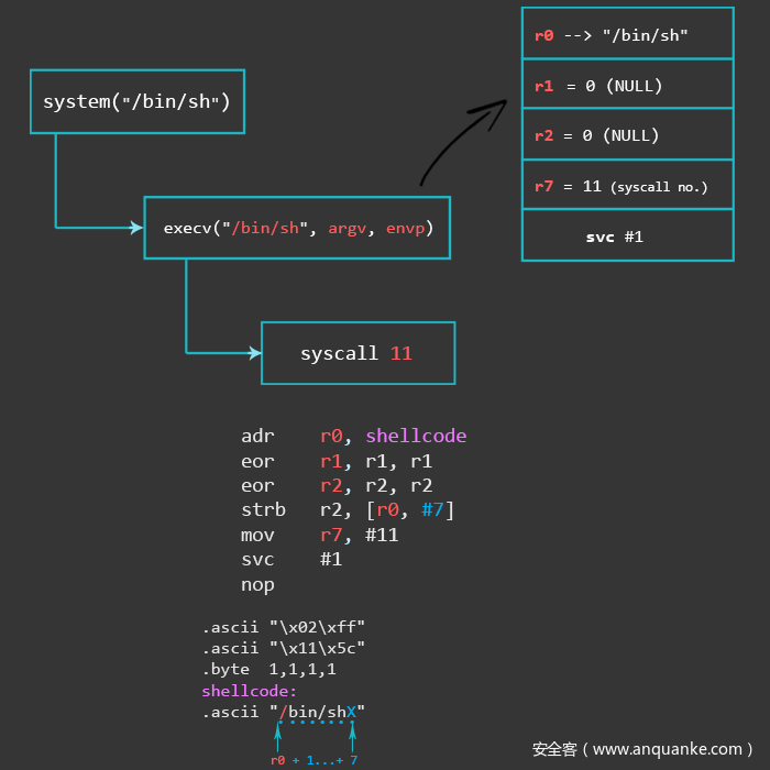 我在如何编写ARM Shellcode教程中给出了一个例子,这里execve()函数的转换过程与之前的例子相同,因此我不会再去详细解释具体步骤。
